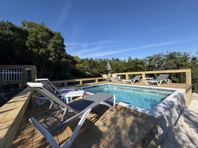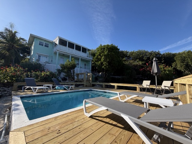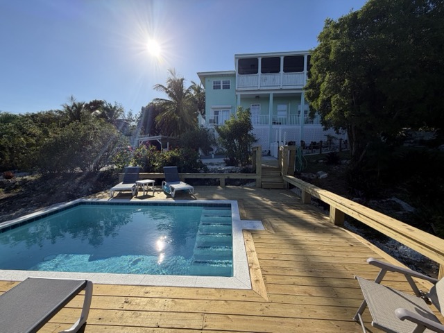 As you arrive in Exuma Bahamas vacation home rentals, you'll be greeted by mature landscaping that creates your own little oasis. The lower level features 3 bedrooms, each with an en-suite bathroom and porch access, plus a laundry area. On the second floor, the fourth bedroom has a bunk bed (twin over double) with an attached half bath. NEW - private heated pool.